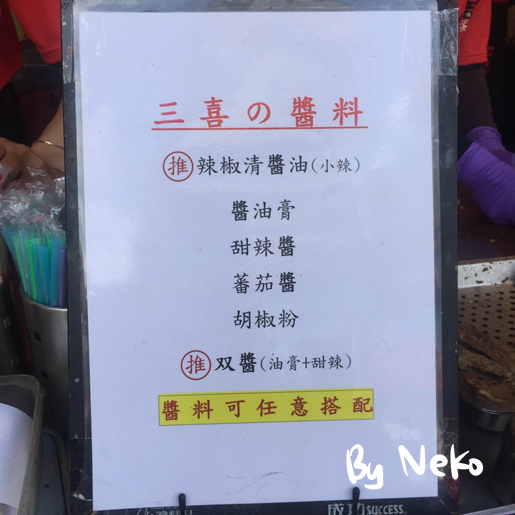 老闆說原本是在太平三民路口的三角窗攤位,叫"阿Q蛋餅",但是老闆因為要註冊商標的關係2月改成"三喜蛋餅",
