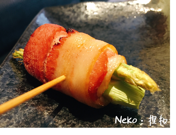培根捲蘆筍,不像一般薄片培根,用的是比較厚實的培根,