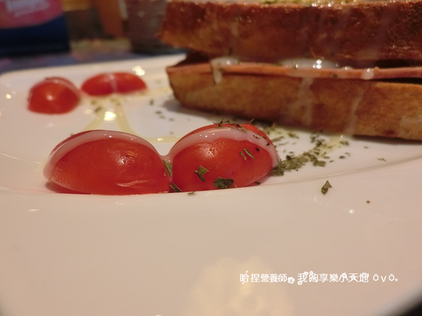 旁邊擺盤的有機番茄鮮甜多汁,讓整道菜口感很多元又富有層次
