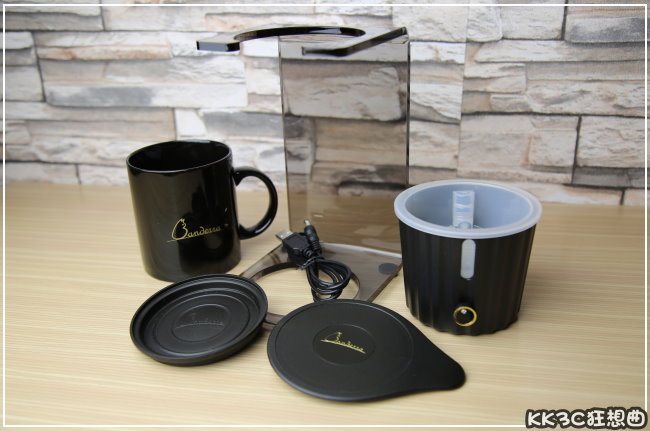 配件:上蓋、主機、支架、盛水盤、班德拉專屬咖啡杯、USB電源線、說明書、保證卡