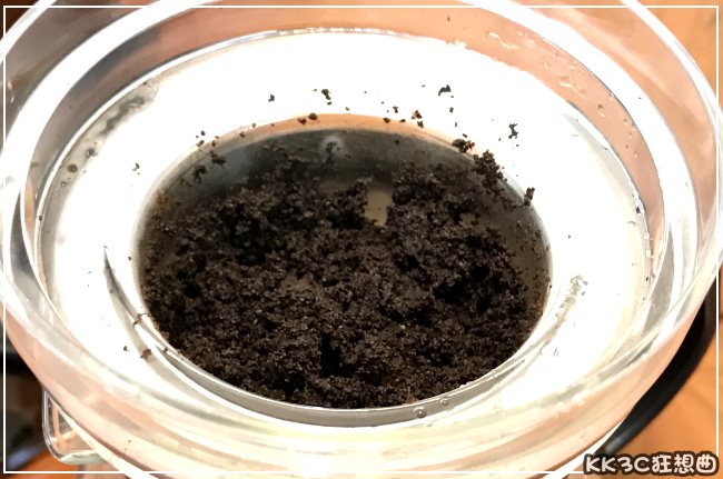 開水倒入咖啡粉中將咖啡粉拌濕。