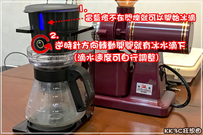 主機裝滿水之後,接著就是插電,在戶外時可以透過行動電源來供電,在家裡時可以用插頭來供電,一開始通電後主機的藍燈會閃爍,當藍燈常亮時,就可以轉動 水量調整鈕 這時候滴下來的就是冰水囉!