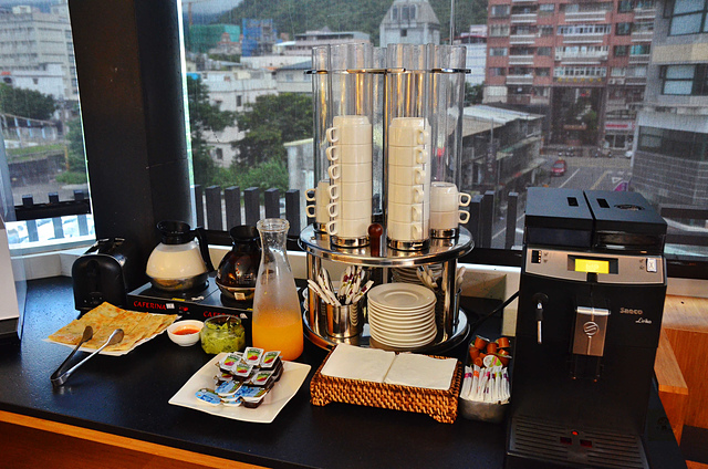 最右側的那台是咖啡機,可以自動衝鬧咖啡,而其他早餐飲料,熱的還有豆漿、紅茶、冰的則是柳橙汁,一旁還有放有沾麵包用的奶油和果醬,這也都是免費取用的。