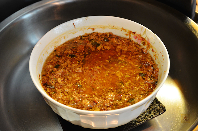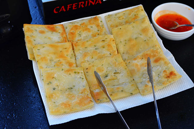 最讓我們驚訝的是這個蔥油餅,切的方方正正的,一開始看還以為是香蔥口味的蘇打餅乾,但聞道蔥油餅的香氣才發現原來是蔥油餅,每盤都是現煎的,一上桌幾分鐘內就會被搶光,只是造型還蠻特殊的,哈,吃的時候可以搭配右上角的酸辣醬,會更有味道喔。