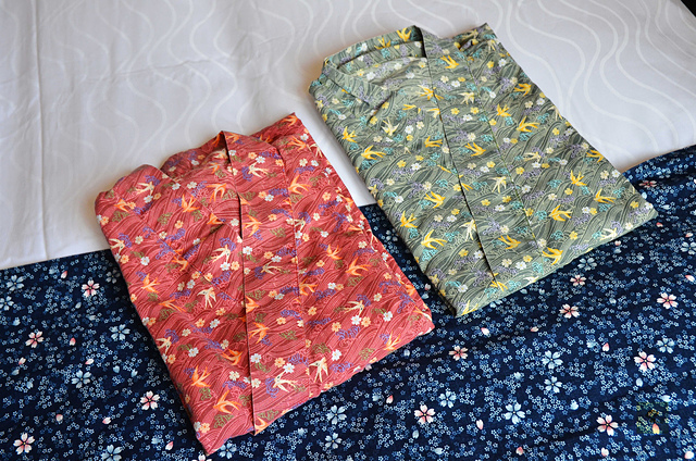浴衣有分成男女兩種色款,浴衣的花紋挺好看的,材質摸起來很軟且薄,夏天穿挺適合的,冬天可能就會有點冷,這浴衣是可以穿出房外喔@_@。