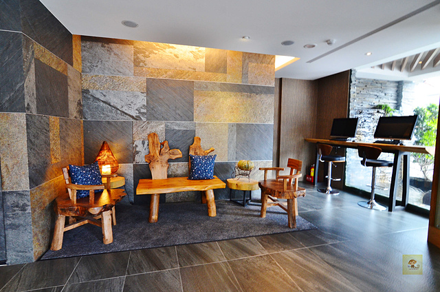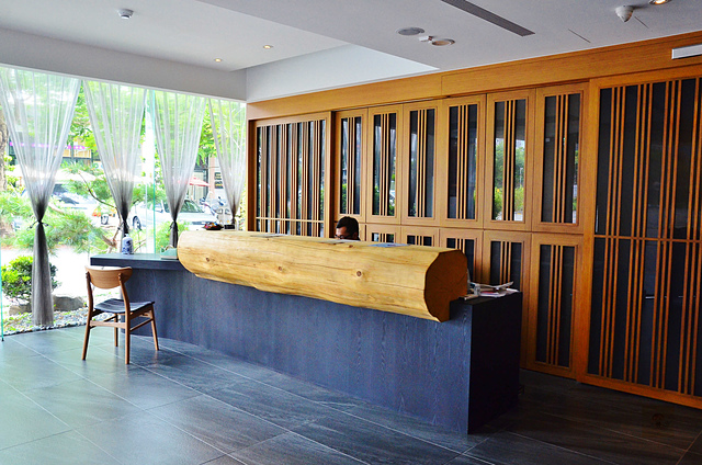 打 開飯店大門後,就可以看到一樓的飯店大廳嚕,飯店櫃檯竟然是用一大塊的原木當成主體,這塊原木要價應該不斐,好奢侈的感覺阿,在這邊出示證件辦理 check in後,就會有專門的飯店人員帶房客上樓到房間介紹房內設施了,印象中這應該是5星級飯店才會有的服務說,沒想到東旅湯宿服務這麼好(超驚訝)。