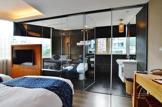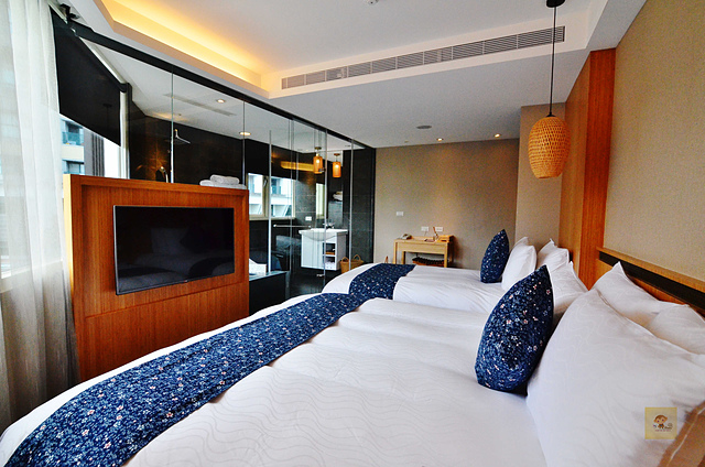 一進門就會先看到浴室和廁所,且全都是透明玻璃的阿阿阿阿阿,這樣讓人洗澡挺害羞的orz,還好飯店人員趕忙說浴室內設有布廉可以遮擋,呼。