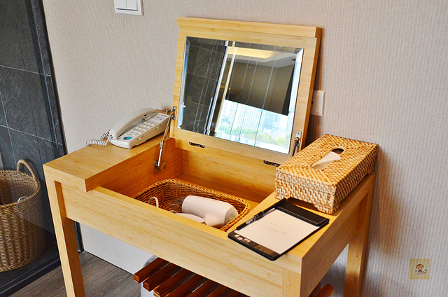 桌子正中央除了可以掀起變成化妝鏡外,內凹的空間內還有收納了吹風機喔,所以不要到處找吹風機了,吹風機就被藏在桌子內。