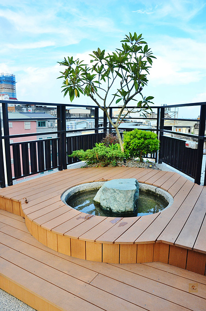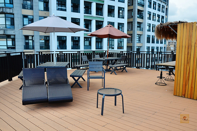 再往上走就是該飯店的觀景台,沒想到東旅湯宿竟然還有一整層的觀景台,從這邊依地勢之利,看出去是礁溪的城景,景色挺漂亮的唷,如果黃昏的時刻上來這邊的話,躺在躺椅上吹著涼爽的風,倒是挺愜意舒適的。