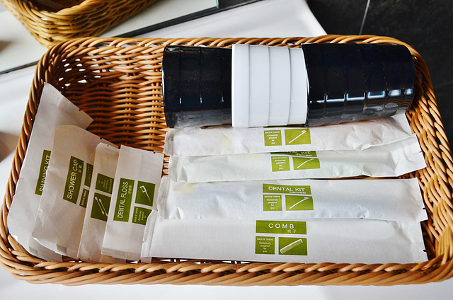 這房間的盥洗用品是收納在洗手台下方的櫃子內,因為是三人房,所以給的是三人份,數量和種類都很齊全。