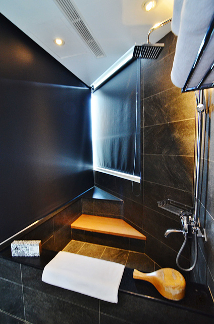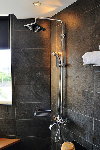 是 跟浴缸做結合成一起,沒有獨立的淋浴空間,水量很穩,但因為是管線末端,所以一但過了用熱水的尖峰時間,一打開的水溫可能會較不那麼熱,這時候就需要等一 小段時間才會較熱或者要通知飯店櫃檯處理,所以建議不要太碗洗澡XDD。這蓮蓬頭有智慧型溫控功能,使用時會有LED的燈光,很炫很酷,來住東旅湯宿的話 一定要用看看XDD。