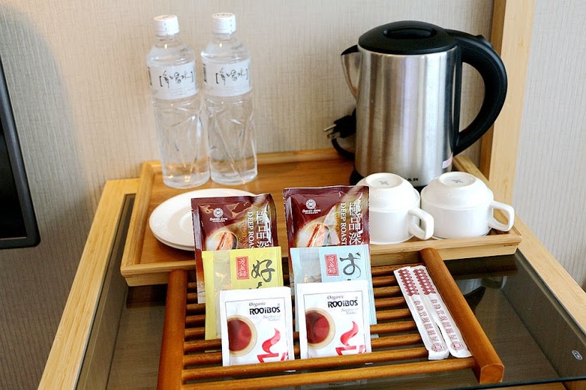 一旁還有提供飲用水及熱水壺 茶包則是有西雅圖咖啡組 烏龍茶 南非國寶茶…等等