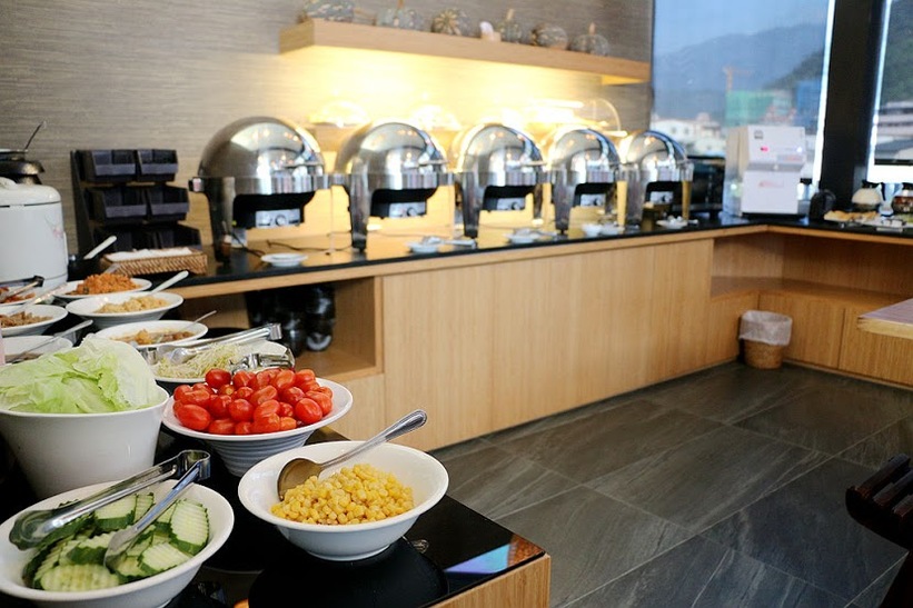 早餐採用自助式 Buffe 除了地瓜粥 還有多種小菜 炒蔬菜 煎蛋 熱狗培根 生菜沙拉蠻豐盛的