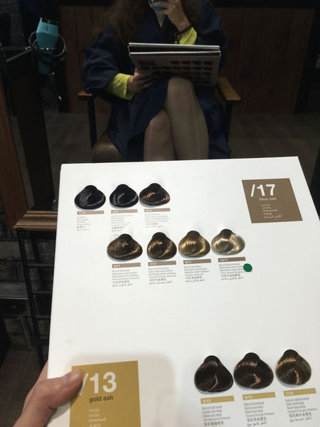 頭髮下半段的顏色已經退掉了,加上養分送不到這一段、已經明顯的毛躁,我之所以可以留著他,是因為我平常都綁馬尾、來個眼不見為淨;染髮是為了讓髮質看起來比較好,但毛躁的淺色染髮反而讓他感覺像一團稻草。 加上我本身髮色無敵黑,我這次想換個布丁長出來、斷層可以比較不明顯的顏色,Allan就建議我冷灰淺褐色。