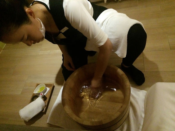 這次體驗的當然是呵護孕媽咪身體療程,療程約90分鐘,療程對象主要針對孕期3個月後的孕婦或是產後一年內的女性,包括足部、腰背或腿部、肩頸頭等部位的舒緩及放鬆。等沐浴完畢後,接著是足浴、足部海鹽代謝護理