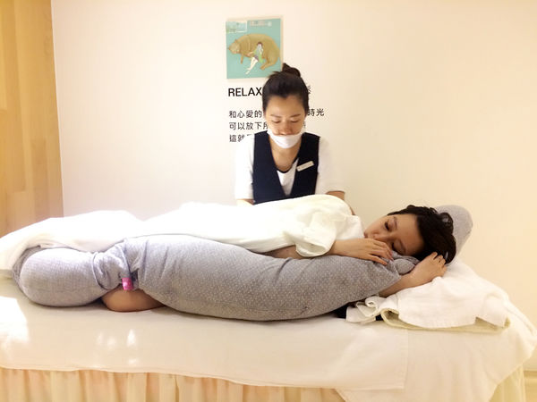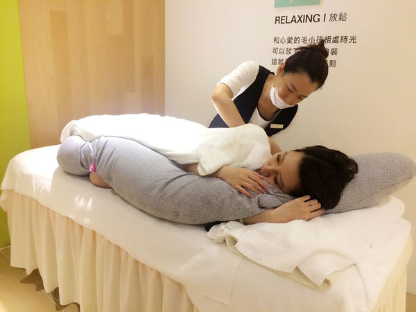 接著才移駕到療程床上,芳療師運用五行經絡開穴的技巧來進行腿部排水代謝,再來進行腰背加強釋壓,當然孕媽咪連躺下都很困難,這點依蘭雅閑也都替孕媽咪們想到摟!!!提供了超大超舒服的側抱枕給孕媽咪使用,過程中超舒服又放心,也不會擔心壓迫到寶寶而感到不適,像我抱到枕頭後,整個都快睡著><。