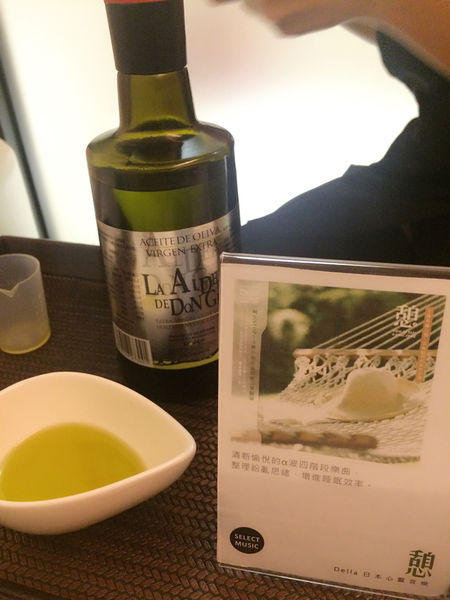 這次芳療師幫我選用的精油是霍夫曼的故事,聞起來酸甜酸甜的味道,有點類似檸檬、甜橙等香氣。這裡還會介紹待會使用的療程音樂是憩-屬於清新愉悅的樂曲,主要是整理思緒、增進睡眠,整個很適合愛亂想的孕媽咪。(不就正在說我>0<)這整組就是等一下我要使用的唷!!!