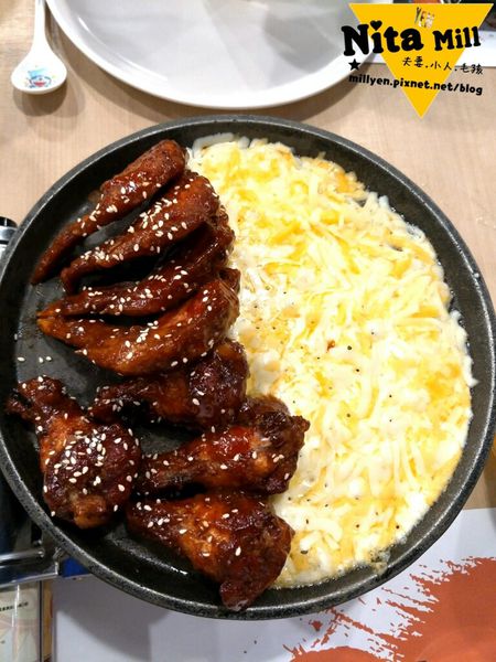 這盤是韓式辣醬起司雞翅,上桌後等起司熱後就要快點享用哦!這個雞腿雞翅不辣,連Nita都敢吃