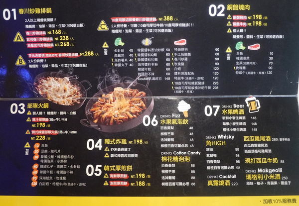 菜色真的蠻豐富的, 一定要來點一下韓式的正宗餐點,像是 春川炒雞排鍋、銅盤燒肉、部隊火鍋、韓式炸雞 都可以來點一下
