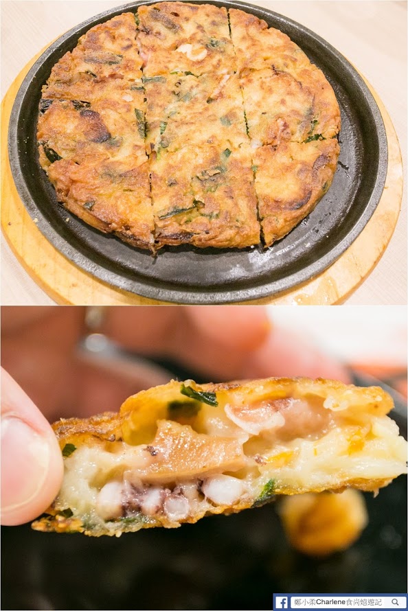 在熱鍋中煎得金黃,熱騰騰焦香味撲鼻的海鮮煎餅