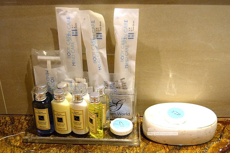 ▼全套的沐浴用品,有洗髮精、潤絲精、沐浴乳、乳液還有香皂、梳子、簡易式刮鬍刀、浴帽等等,都是很實用的必備小物