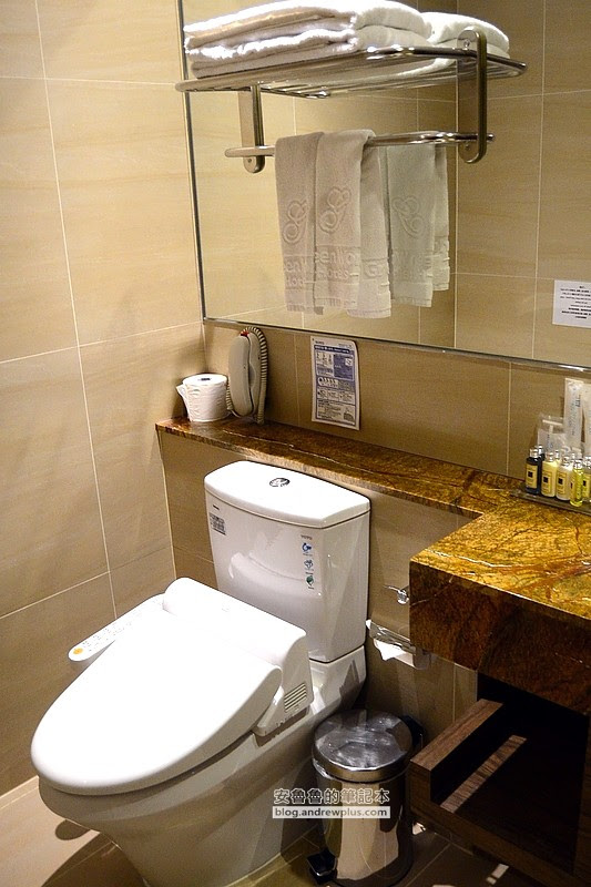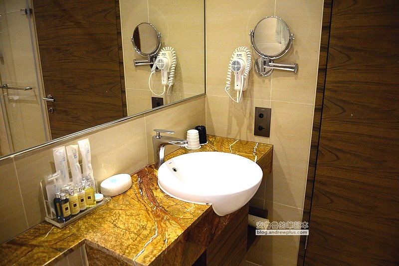 ▼洗手台附近也備妥了需要的衛浴用品,如吹風機、伸縮鏡、漱口杯以及刮鬍刀專用的插座,安魯魯對於這些設備倒也不是太講究,但也曾看過論壇上有人抱怨飯店提供這種壁掛式的吹風機,而不是知名廠牌有負離子風的~客人還真是百百種,每個人著重的點都不太一樣