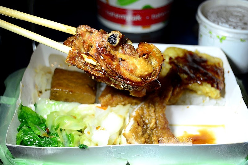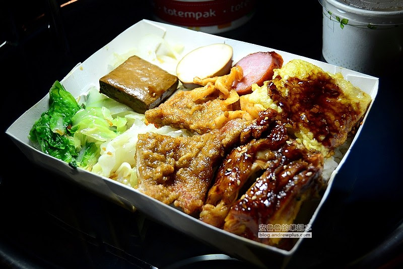 ▼這個便當裡面的菜色相當豐富,有雞腿、排骨、香腸、青菜、豆乾等等