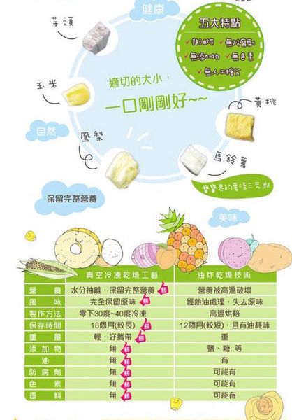 ☆非油炸-使用低溫真空冷凍乾燥技術製成,把蔬果水分抽離,保留完整營養
