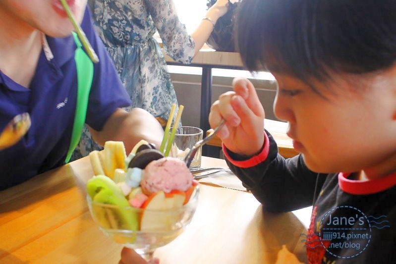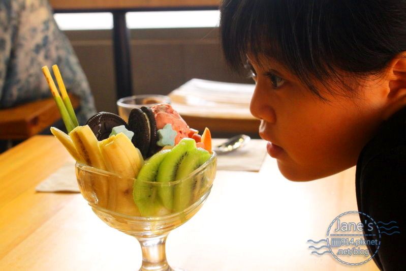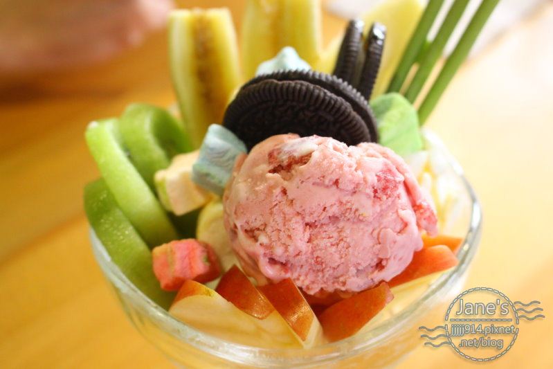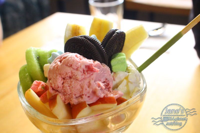 一旁有香蕉跟奇異果、蘋果的大塊切片,加上另一球香草冰淇淋,