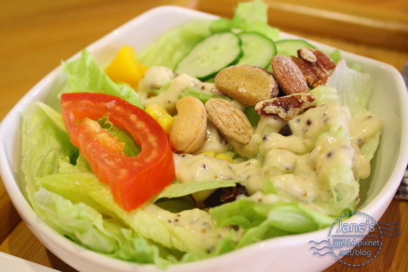 生菜沙拉的醬汁是有點嗆辣酸甜的沙拉醬汁,