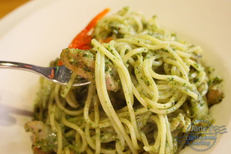 麵條Q彈有勁,加上九層塔(羅勒)味很明顯的青醬,鹹香雞肉很對味。
