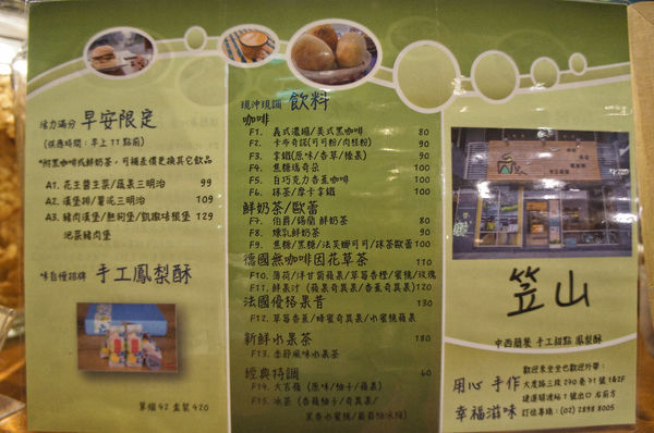 這次誤打誤撞的吃到這間位於關渡站的「笠山咖啡」,覺得是滿不錯的經驗,除了知道他們也是講求健康食材,不添加人工香料跟其他添加物,甜點也是使用頂級發酵奶油以及南投和豐高品質雞蛋(無藥物及抗生素),這些都讓我覺得很滿意~阿阿對了,聽說他們也有自己做鳳梨酥!而且還是什麼全台月餅海選的第三名喔!(認真覺得老闆夫妻太有才了~),在店員隨餐給我們的介紹單上,看到他說