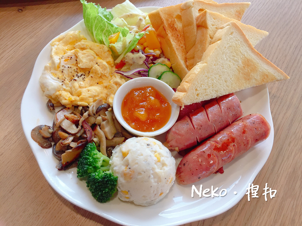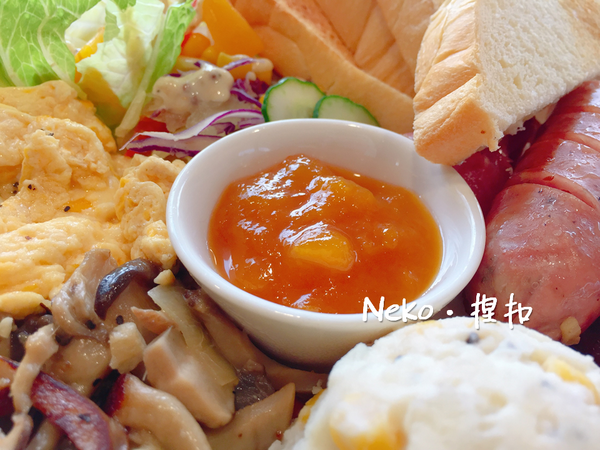 這道除了香腸是選用信譽良好的信功肉品以外,其它的都是店家選用天然食材或是自製的唷!烤得香酥的鮮奶吐司搭配芒果醬或夾上其它配料都很適合~