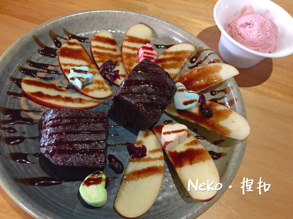 用蘋果切片擺盤得像朵花,灑上棉花糖、蔓越莓果乾、搭配上一球莫凡彼冰淇淋,濕潤濃郁的溫熱布朗尼搭配冰淇淋產生冰火交融的口感