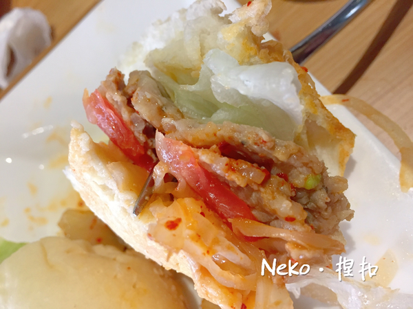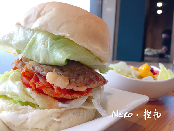這…長高高的漢堡,根本無法一口咬下耶!自製的漢堡麵包 & 肉排,看得到絞肉,不是外面那種碎碎糊糊的加工肉排,雖然有點容易散掉,但是吃起來更安心