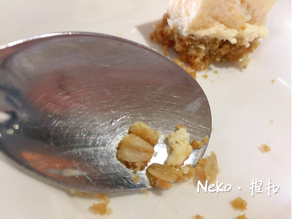 奶香味很足的綿密乳酪蛋糕,搭配底下的酥脆餅乾底,我覺得我好像在尋寶唷!!!在餅乾底裡發現燕麥片,所以又多了點不同的口感,喜歡這些巧思,雖然是小小的地方不同卻讓人感受到獨特