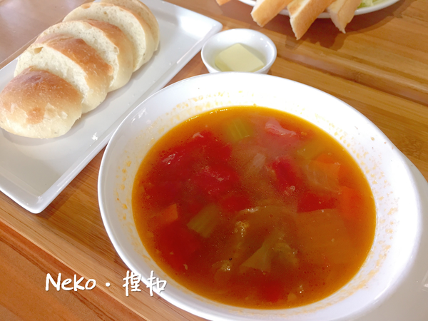 看起來很簡單樸實的一道,普羅旺斯蔬菜牛肉湯配上店家自製的手工麵包,