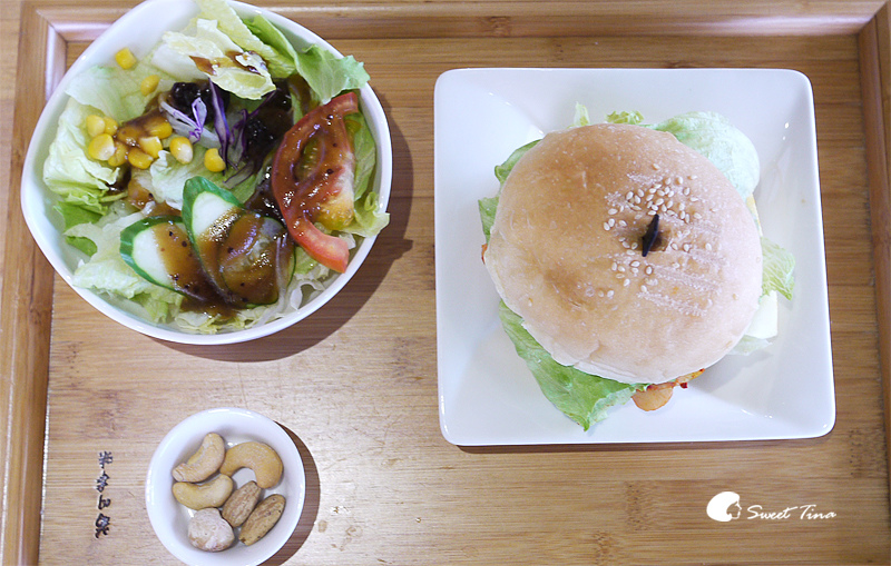 而我點的是泡菜豬肉漢堡套餐 $180 ,一樣附上飲料、生菜沙拉及一小疊堅果~