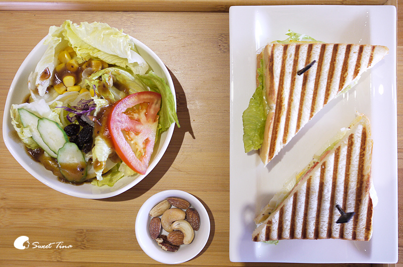 而我也幫瑋兒點了一份雞蛋起司帕尼尼 $180,有附飲料、生菜沙拉及一小疊堅果,真的是營養滿分! 這份帕尼尼口味上雖沒有什麼特別突出的地方,不過笠山標榜鮮奶吐司採純鮮奶製成,不添加一滴水,且採用豐高品質雞蛋(無藥物無抗生素),我想這份餐點是很適合給孩子們食用的!