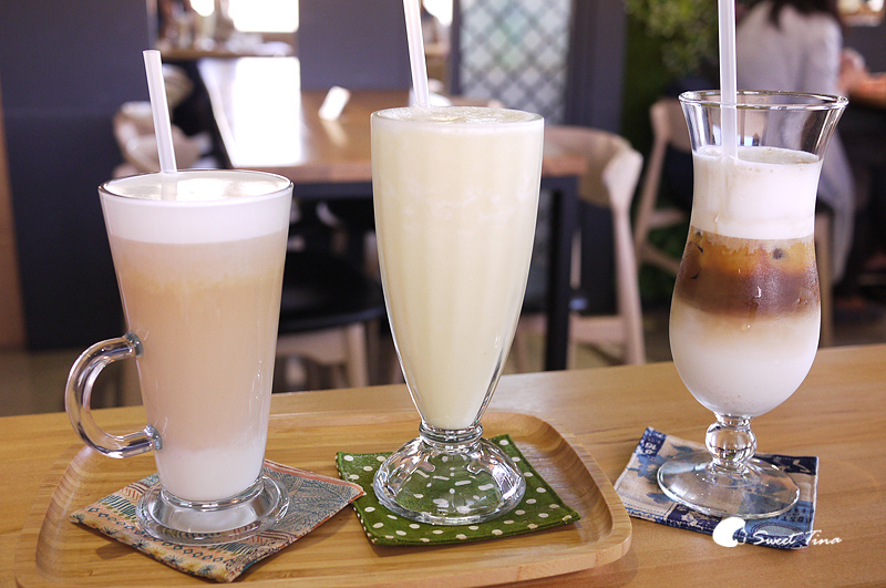 再來上場的是我們另外加點的飲料,由左到右是~ 煉乳鮮奶茶 $90、水蜜桃蘋果優格果昔 $130、榛果拿鐵 $90,如果有點餐點的話,加購飲料可折抵20元~