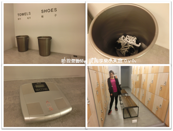 大大的桶子分別裝著回收的毛巾和待會騎飛輪要穿的卡鞋,旁邊還擺了一台體脂機,對於長期規劃運動的人來說,體脂可是指標之一呢!