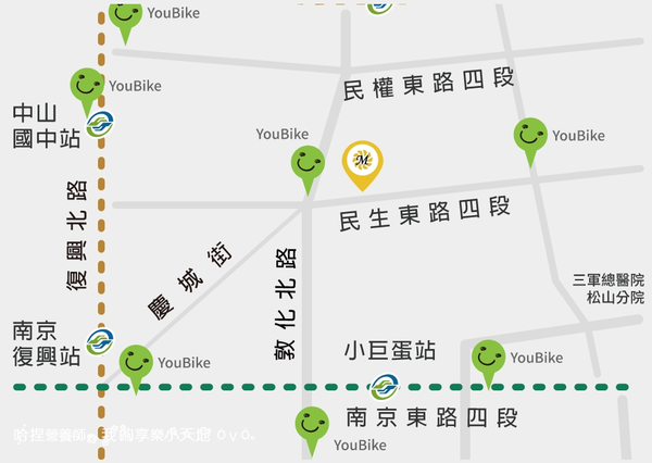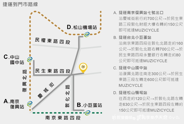 《MUZICYCLE》位於民生社區附近,附近有捷運站包圍,有中山國中站、南京復興站、松山機場站和小巨蛋站,我們是從南京復興站7號出口走慶城街去的,大約10分鐘的路程就到囉!