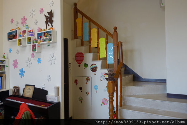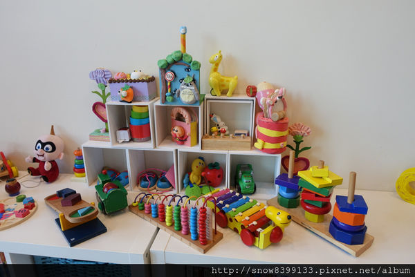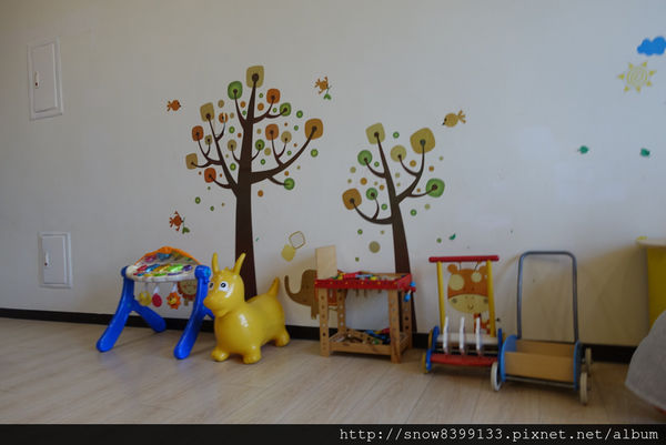 兩旁有一些簡單的玩具,牆上有可愛的壁貼