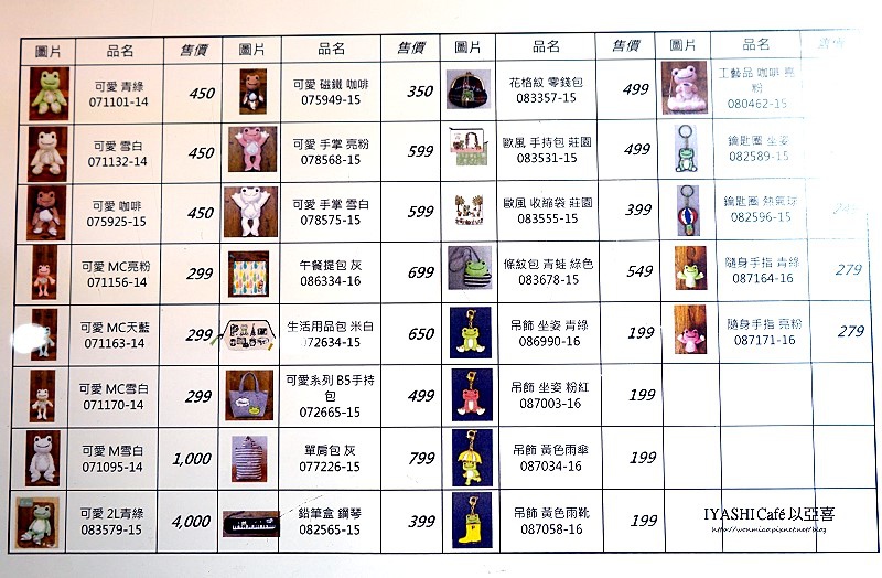 櫃枱上提供微笑青蛙周邊商品的價目表,可自由選購。