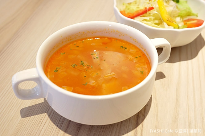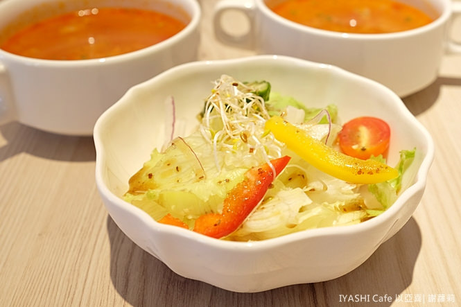 升級套餐提供了二種選擇,+30元每日例湯及沙拉二選一、+60元則包含湯品及沙拉,另外只要點主餐,加點飲料全面可以享有八折優惠,這天喝到的蕃茄蔬菜湯是很清爽的滋味,跟沙拉是同個路線,吃來同樣開胃而無負擔。