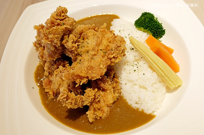簡單擺盤,模樣看上去卻十分可口,水煮玉米筍、花椰菜、紅蘿蔔,是點綴、也是配色,炸雞金黃酥脆的模樣,看起來就很好吃,咖哩醬算搭配得剛剛好,不多不少、是巧妙的存在。