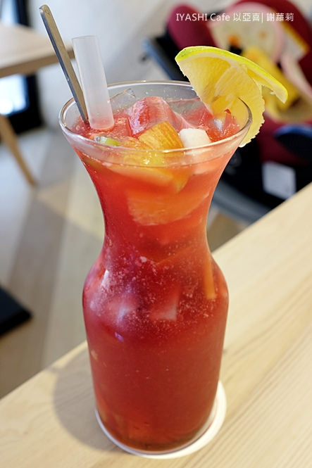 跟想像中是柳橙色水果茶不太一樣,而是帶著透光的瑰麗色澤,以蔓越莓當底,喝來會比較偏酸滋味,裡面還吃得到不少新鮮水果。