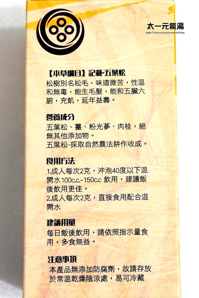 太一元氣湯肉成份除了五葉松外,還添加了薑,粉及肉桂。