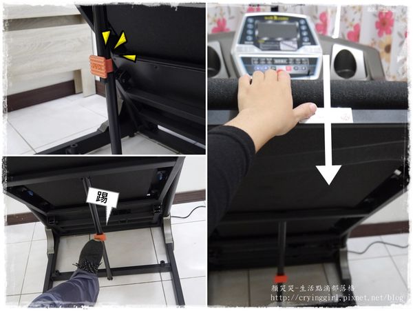 跑步機下面有根支柱,上面有個寫著「PUSH」的橘色方塊卡榫,