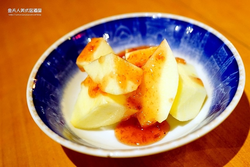 當天多招待的小菜是蘋果加上酸梅醬做成的開胃前菜,